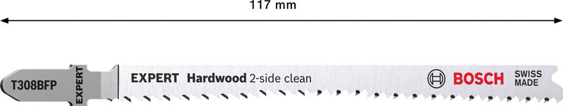 Hohe Präzision für ausrissfreies Schneiden von laminierten Arbeitsplatten! Bi-Metall Blatt: Kombiniert harte Zähne mit flexiblem Blattkörper Unter Tischlern und Schreinern war es schon immer eine Kunst sicherzustellen, dass der sichtbare Teil des Arbeitsmaterials die „saubere Seite“ eines Stichsägenschnitts zeigt. Manchmal muss man das Werkstück zum Sägen umdrehen. Oder die Stichsäge sägt von der Rückseite, um die gewünschte Schnittqualität auf der Sichtseite zu haben. Oder du verwendest das EXPERT Hardwood 2-side clean-Blatt, das dank seiner Zahngeometrie auf beiden Seiten einen perfekten, ausrissfreien Schnitt bietet. Hergestellt aus Bi-Metall – einer Leiste aus Schnellarbeitsstahl, die auf ein flexibles Stahlblatt geschweisst wird, um Festigkeit und Flexibilität zu kombinieren – ist das Bosch EXPERT Hardwood 2-side clean-Stichsägeblatt robust genug, um beschichtete Küchenplatten aus Grobspanplatten oder Hartholz zu schneiden. Erhältlich für ausrissfreie, gerade Schnitte (T308BF) und für besonders genaue ausrissfreie Winkelschnitte (T308BFP). Ausrissfreie Schnitte mit 2-side Clean Geometry