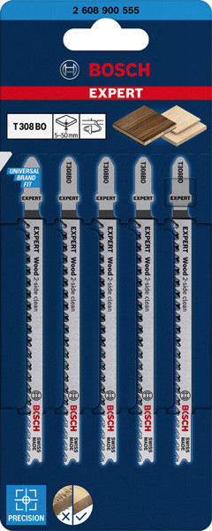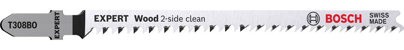 Hochpräzises, ausrissfreies Schneiden von Holz! Extrascharfe Zähne durch Präzisionsschliff Unter Tischlern und Schreinern war es schon immer eine Kunst sicherzustellen, dass der sichtbare Teil des Arbeitsmaterials die „saubere Seite“ eines Stichsägenschnitts zeigt. Manchmal muss man das Werkstück zum Sägen umdrehen. Oder die Stichsäge sägt von der Rückseite, um die gewünschte Schnittqualität auf der Sichtseite zu haben. Oder du verwendest das EXPERT Wood 2-side clean-Blatt, das dank seiner Zahngeometrie auf beiden Seiten einen perfekten, ausrissfreien Schnitt bietet. Mit seinen besonders scharfen, präzisionsgeschliffenen Zähnen eignet sich das Bosch EXPERT Wood 2-side clean-Stichsägeblatt gut zum Schneiden von Weichholz mit einer Dicke von bis zu 50 mm. Möbelschreiner können ein perfektes Ergebnis erzielen und verlieren nicht nach jedem Stichsägenschnitt Zeit durch Schleifen. Erhältlich für gerade Schnitte (T308B), für Kurvenschnitte (T308BO) und für genaue Winkelschnitte (T308BP). Ausrissfreie Schnitte mit 2-side Clean Geometry