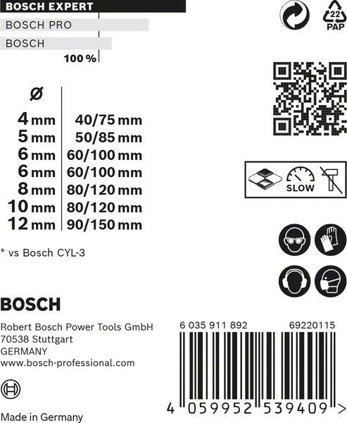 Hochpräzises Bohren in verschiedene Materialien! Präzises Anbohren von Löchern dank einer speziell konzipierten Zentrierspitze Moderne Baustellen erfordern das Arbeiten mit vielen verschiedenen Materialien und man weiß nie, was man als Nächstes bohren muss. Es kann schwierig und zeitaufwendig sein, den richtigen Bohrer zu finden – es sei denn, du hast den EXPERT Multi Construction-Bohrer. Der Bosch EXPERT CYL-9 Multi Construction-Rundschaftbohrer darf in keinem Werkzeugkasten fehlen: Man kann jede Arbeit präzise erledigen und verliert keine Zeit mit der Suche nach dem richtigen Bohrer. Präzises Bohren ist mit Bosch Centering Geometry noch einfacher