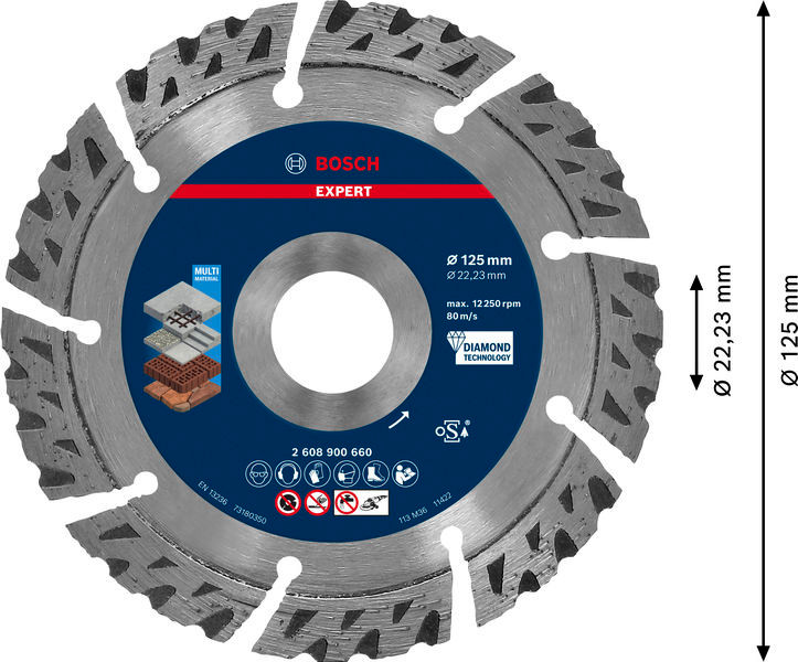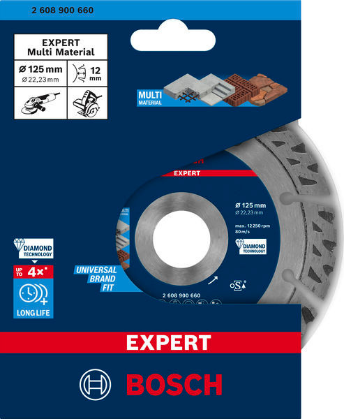 | Leistungsbeschreibung | Hält bis zu 4-mal länger als eine Bosch 2608615028 Multi Material Diamanttrennscheibe |