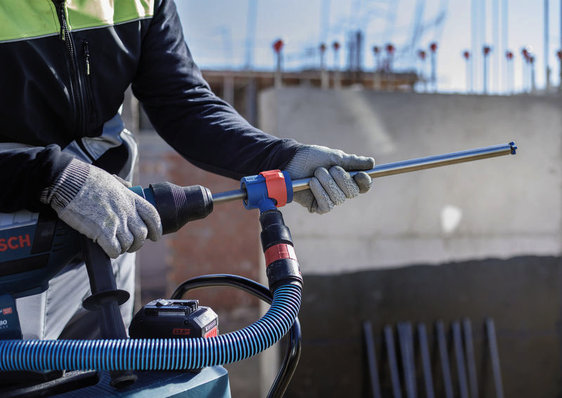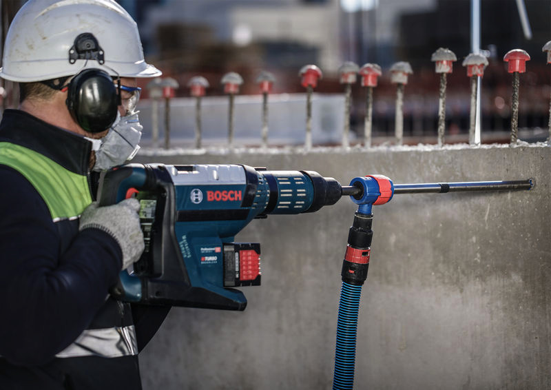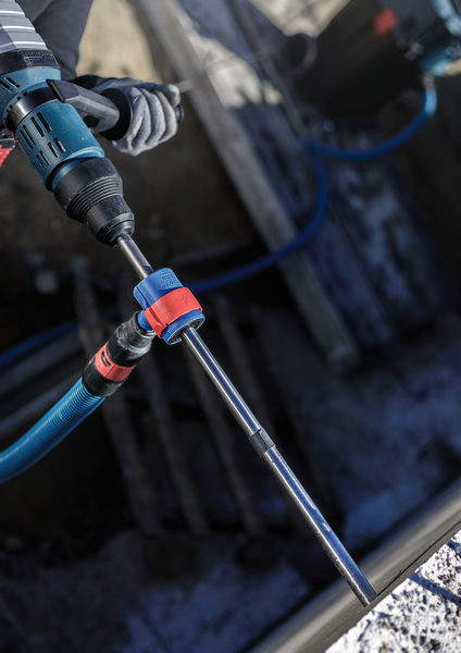 Bohren in Stahlbeton mit verbesserter Staubreduzierung! Durchdringt Stahlbeton mit einem Voll-Carbide-Kopf mit 4 Schneidern Das Bohren präziser Löcher in Beton ist nur ein Schritt bei der Installation chemischer Dübel. Der nächste Schritt besteht in zeitraubenden Reinigungsarbeiten. Mit dem EXPERT SDS Clean max-8X wird alles anders. Das System bohrt Löcher und entfernt gleichzeitig Staub. Das beschleunigt und vereinfacht die Installation chemischer Dübel. Wir haben EXPERT SDS Clean max-8X Bohrer für Bauarbeiter und Installateure entwickelt, die Löcher für chemische Dübel bohren müssen. Der Bohrer ist mit einem 4-Schneider-Vollhartmetallkopf und einem robusten Staubsaugerrohr ausgestattet. Das Zubehör wird zusammen mit dem SDS Clean max Anschluss eingesetzt, der für alle SDS Clean max-8X Bohrer geeignet und ebenso einfach zu montieren wie abzunehmen ist. Du erhältst also einen leistungsstarken Bohrer, der bei Verstopfung leicht zu reinigen ist (einfach das Absaugrohr vom Bohrer abnehmen) sowie eine neue Technologie zur Staubreduzierung, mit der du Löcher für chemische Dübel schneller vorbereiten kannst. Zudem ist die Luft am Arbeitsplatz sauberer. Hocheffizienter Abtransport von Staub mit Bosch Particle Control