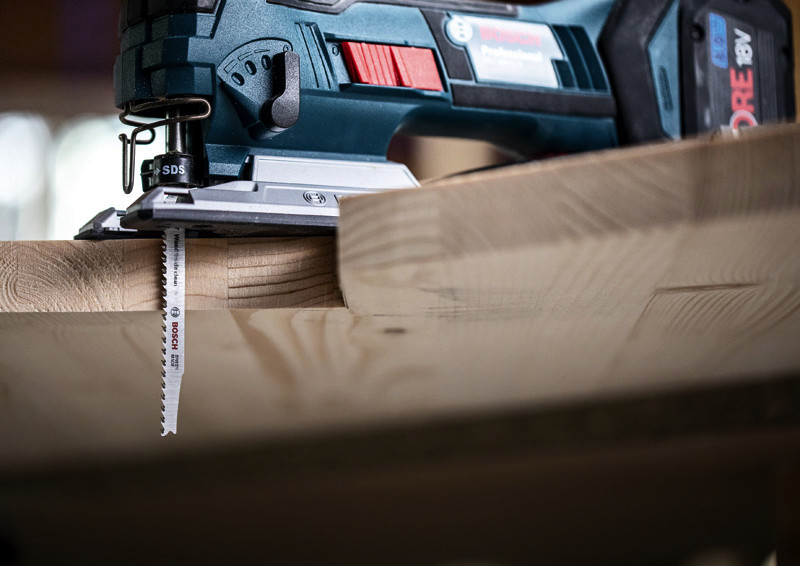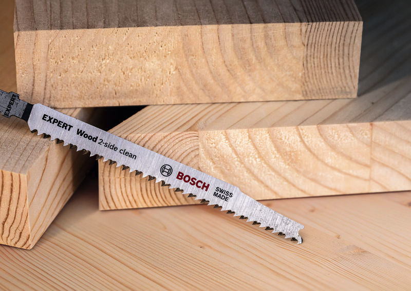 Hochpräzises, ausrissfreies Schneiden von Holz! Extrascharfe Zähne durch Präzisionsschliff Unter Tischlern und Schreinern war es schon immer eine Kunst sicherzustellen, dass der sichtbare Teil des Arbeitsmaterials die „saubere Seite“ eines Stichsägenschnitts zeigt. Manchmal muss man das Werkstück zum Sägen umdrehen. Oder die Stichsäge sägt von der Rückseite, um die gewünschte Schnittqualität auf der Sichtseite zu haben. Oder du verwendest das EXPERT Wood 2-side clean-Blatt, das dank seiner Zahngeometrie auf beiden Seiten einen perfekten, ausrissfreien Schnitt bietet. Mit seinen besonders scharfen, präzisionsgeschliffenen Zähnen eignet sich das Bosch EXPERT Wood 2-side clean-Stichsägeblatt gut zum Schneiden von Weichholz mit einer Dicke von bis zu 50 mm. Möbelschreiner können ein perfektes Ergebnis erzielen und verlieren nicht nach jedem Stichsägenschnitt Zeit durch Schleifen. Erhältlich für gerade Schnitte (T308B), für Kurvenschnitte (T308BO) und für genaue Winkelschnitte (T308BP). Ausrissfreie Schnitte mit 2-side Clean Geometry