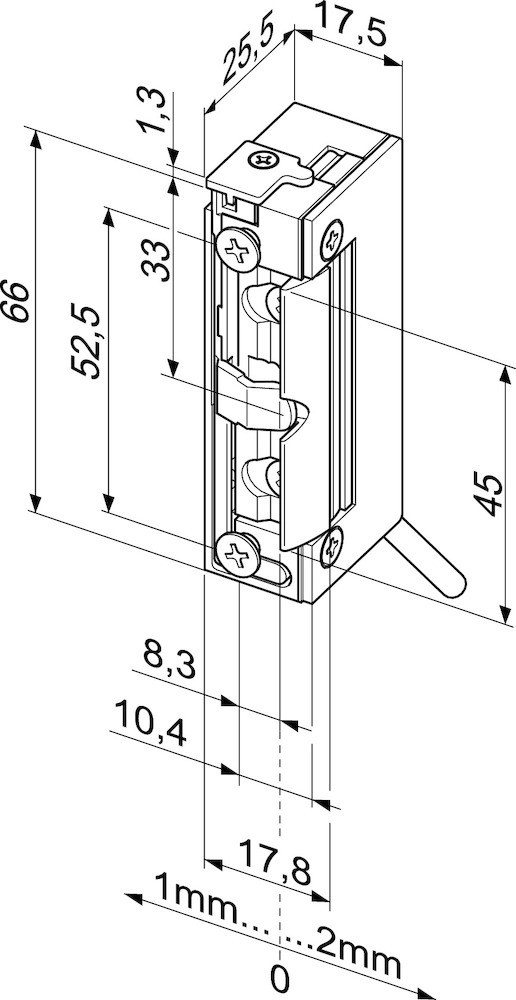 effeff Elektro-Türöffner 138WR; Bauform: symmetrisch; Einbaulage: senkrecht,waagerecht; Befestigungsart: zum Einlassen; Entriegelung: ohne; Norm: DIN EN 14846; Einsatzbereich: Türrahmen; Basis: Elektro-Türöffner; Ausführung: ohne Schließblech,mit Rückmeldekontakt; DIN-Richtung: DIN Links-Rechts; Funktion: Ruhestrom; Stromart: DC; Stromanschluss: klemmbar,steckbar; Spannungsart: DC; Kompatibel: zu Standard Einsteckschloss,zu Standard Schließblech; Öffnerbreite: 16mm; Öffnerhöhe: 74mm; Betriebstemperatur min.: -15°C; Öffnertiefe: 25,5mm; Betriebstemperatur max.: 40°C; Verstellbereich Falle: 3mm; Aufbruchfestigkeit: 3.750N; Nennwiderstand: 160O; Stromaufnahme DC: 150mA; Türflügelanzahl: einflügelig; Türart: Abschlusstür; Türausprägung: Türe gefälzt,Türe stumpf; Rahmenwerkstoff: Holz,Aluminium,Kunststoff; Falleneigenschaft: verstellbar; Falleneingrifftiefe: 5,5mm; Fallenvorlast DC max.: 30N; Spannung: 24V