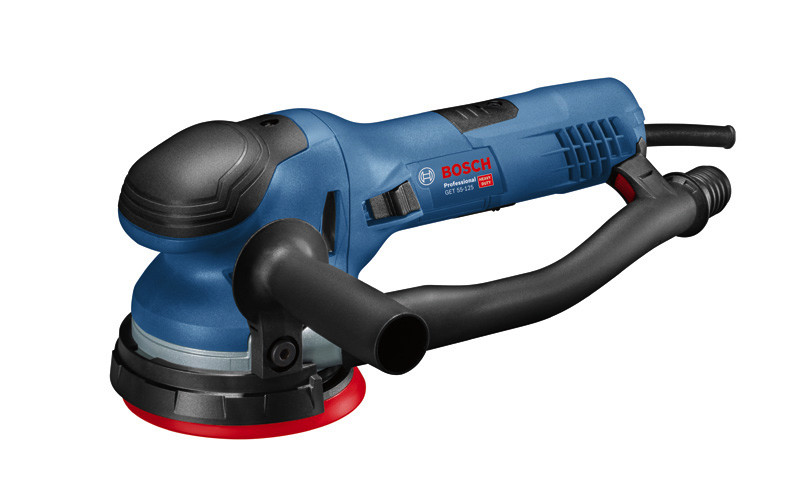 Exzenterschleifer GET 55-125, Der GET 55-125 Professional ist der kabelgebundene (125 mm) Exzenterschleifer mit Direktantriebsmodus von Bosch mit herausragender Werkzeugkontrolle und Handhabung. Ausgestattet mit einer perfekt geformten ergonomischen Handauflage und einem Handgriff mit nur 18 cm Griffumfang für die optimale Werkzeugkontrolle. Dank seines Multiloch-Schleiftellers, der auch die Staubabsaugung deutlich erhöht, können alle Schleifblätter unabhängig vom Lochraster problemlos verwendet werden. Er verfügt über einen extrem leistungsstarken 550-Watt-Motor mit Tellerrotation im Direktantriebsmodus für eine bis zu 27 % höhere Abtragsrate. Dieser kabelgebundene Schleifer ist für den Grundschliff, den Zwischenschliff, den Lackabtrag, die Endbearbeitung und das Polieren von Oberflächen vorgesehen. Er ist einsetzbar bei Holz, Furnier, Lack, Füllstoffen, Mineralstoffen und Acryl. Es ist kompatibel mit dem Bosch Click & Clean Staubabsaugsystem. Der GET 55-125 verfügt auch über eine konstante Drehzahl, einen Direktantriebsmodus, einen Kantenschutz, einen 125-mm-Schleifteller mit Klettverschluss zur Schleifblattbefestigung, und Drehzahlvorwahl. Karton. Schleifteller (125 mm) (2 608 601 332). 1 x Schleifblatt M480, Best for Wood and Paint, 120 (separat erhältlich als 5er-Pack: 2 608 621 146). Schutzring für 125 mm (2 607 017 496). Zusatzhandgriff inkl. Schraube (2 607 017 500). Ausblasrohr für 125 mm (2 607 017 498). Innensechskantschlüssel