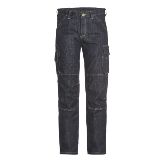 FHB WILHELM Jeans Arbeitshose LYCRA-STRETCH, 2 große Seitentaschen mit 1 Münztasche, 2 große Gesäßpattentaschen, 1 Zollstocktasche und Handytasche, 1 Volumen-Beintasche mit Patte und Stifttaschen, innenliegende Kniepolstertaschen