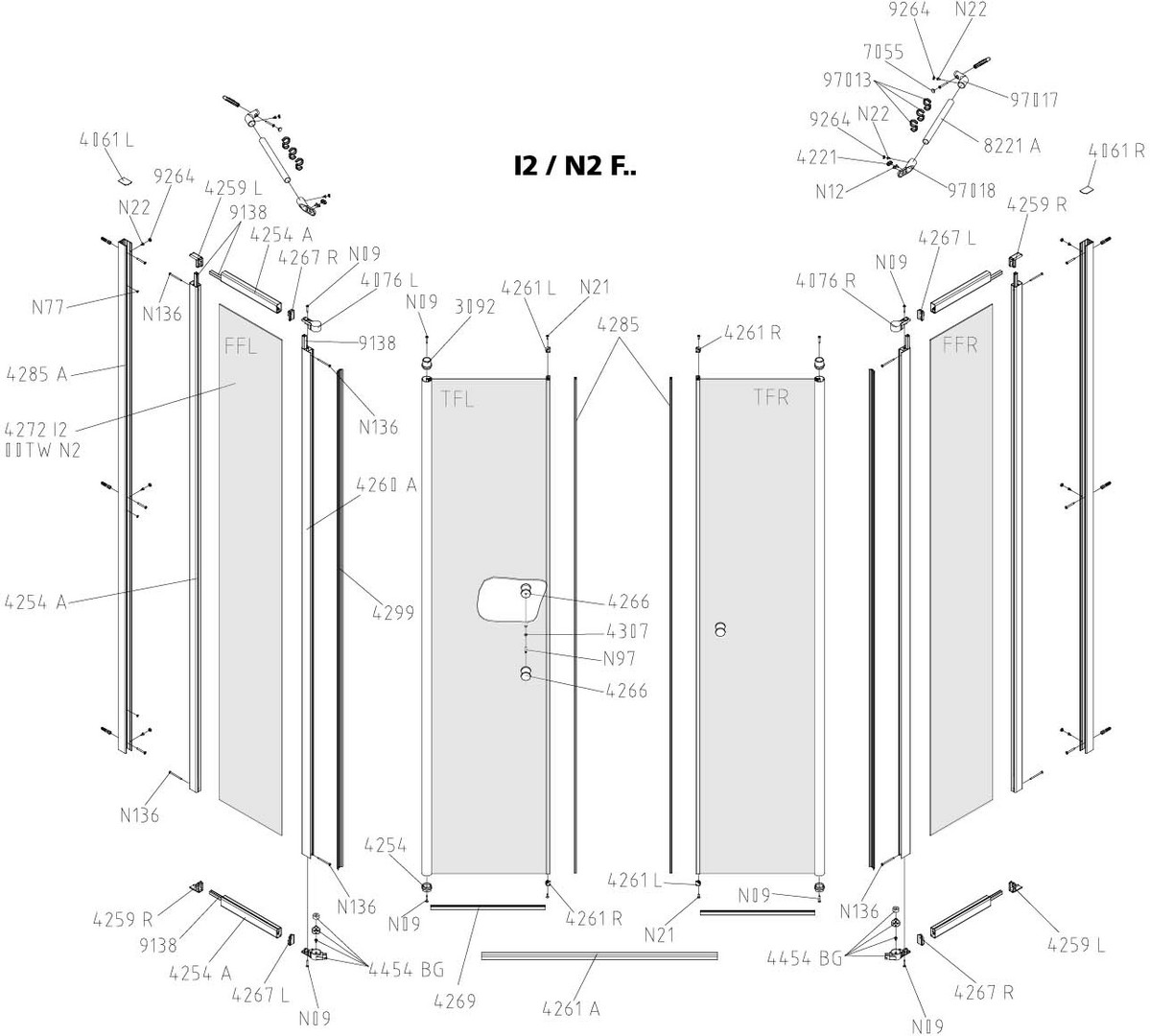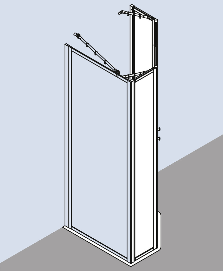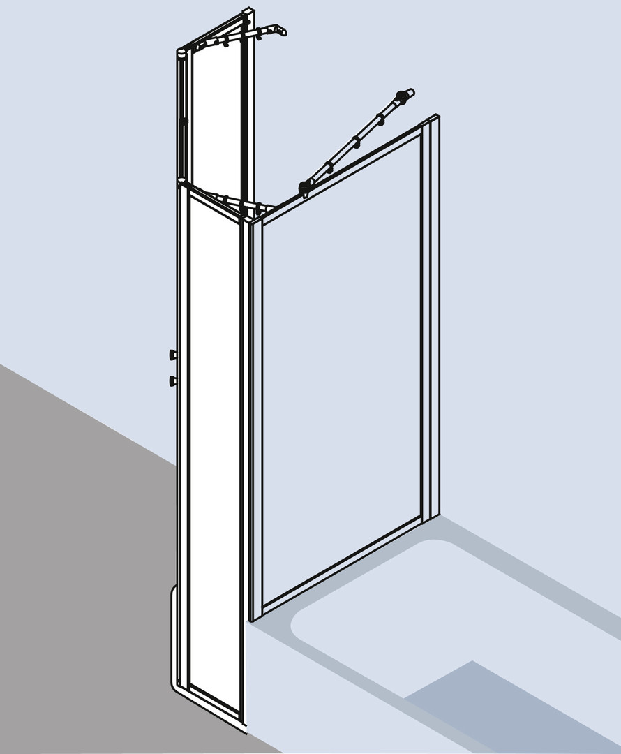 Glasstärke 3/4 mm, mit 2 Türflügeln, nach innen und außen öffnend, mit 2 Festfeldern, mit Stabilisierungen (innen), Profile aus eloxiertem Aluminium, Griffe aus Kunststoff, Verstellmöglichkeit im Wandprofil 17 mm, Türprofile mit Hebe-Senk-Mechanismus, durchgehende Magnetleisten und Dichtprofile, mit Bodenschwelle (Höhe 16 mm), mit Befestigungsmaterial