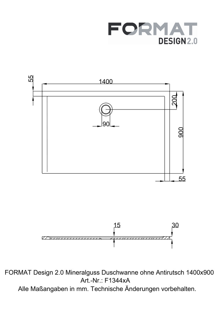 FORMAT Design 2.0 Duschwanne Mineralguss 140 x 90 x 3 cm, weiß, ohne Antirutsch