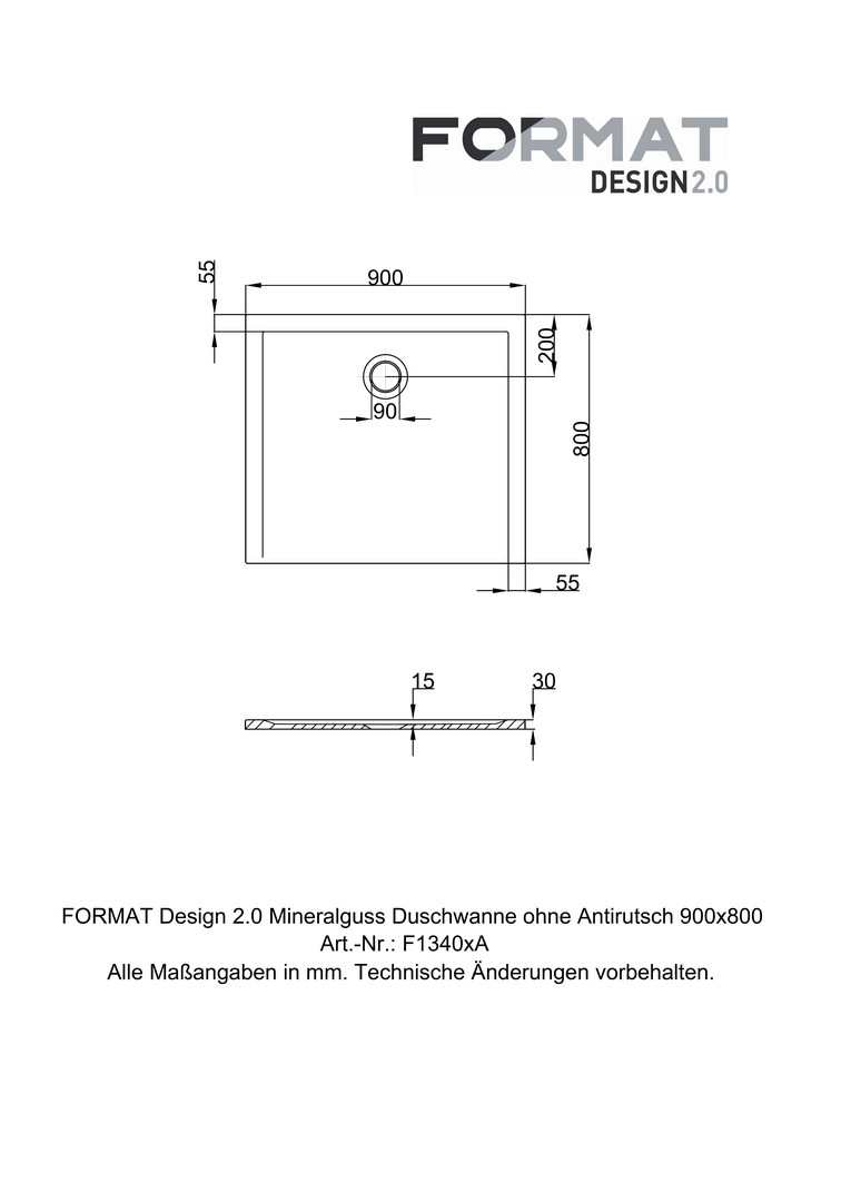 Ablauf seitlich, mittig platziert, ohne Füße, ohne Ablaufprogramm, Ablauf Ø 90 mm, mit Gelcoat-Oberfläche, Gesamthöhe 30 mm, Innentiefe 15 mm