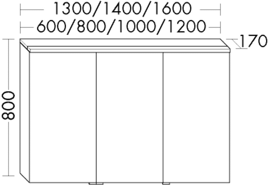 horizontale LED-Aufsatzleuchte, Spiegeltüren beidseitig verspiegelt, 4250 K, Glaseinlegeböden, Schalter-/Steckdosenelement, IP24, Tiefe 170 mm