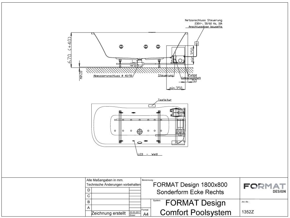 aus Acryl, in Sanitärqualität, Ablauf mittig versetzt zur Überlaufbohrung hin, mit bereits verbauten Gestell und Überlauf- sowie Ablaufgarnitur, Ablauf Ø 52 mm, aus Plattenmaterial tiefgezogen,rückseitige Glasfaser-/Polyesterverstärkung und zusätzliche Stabilisierung im Bodenbereich