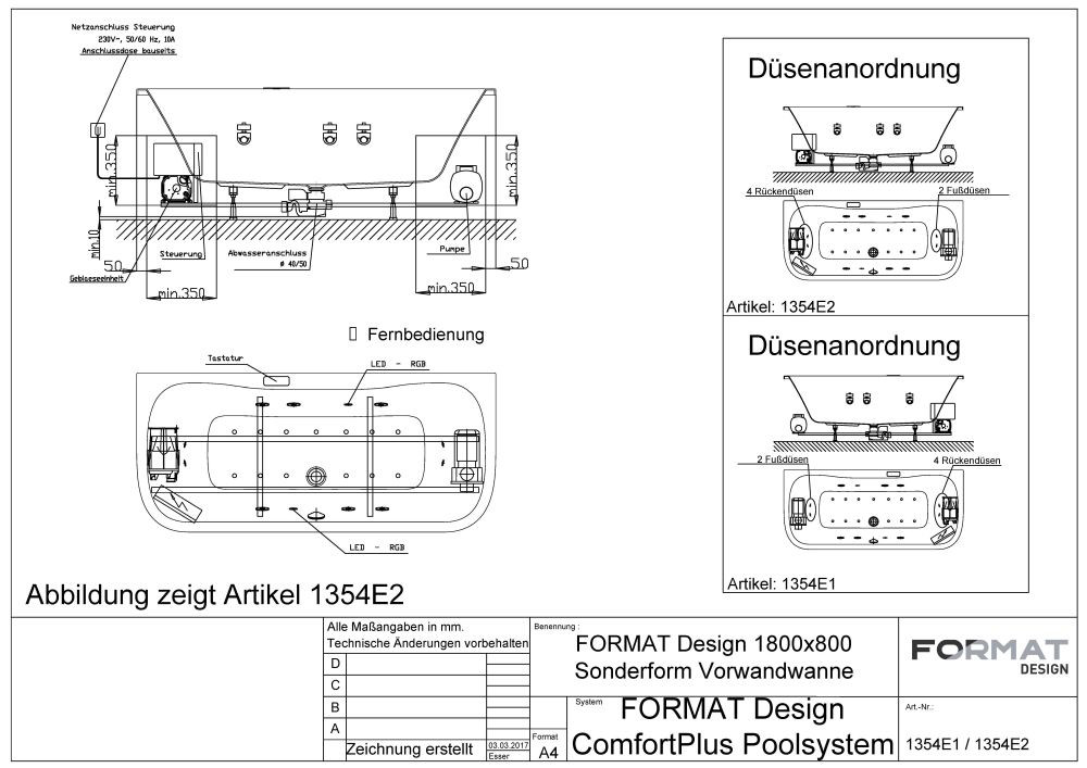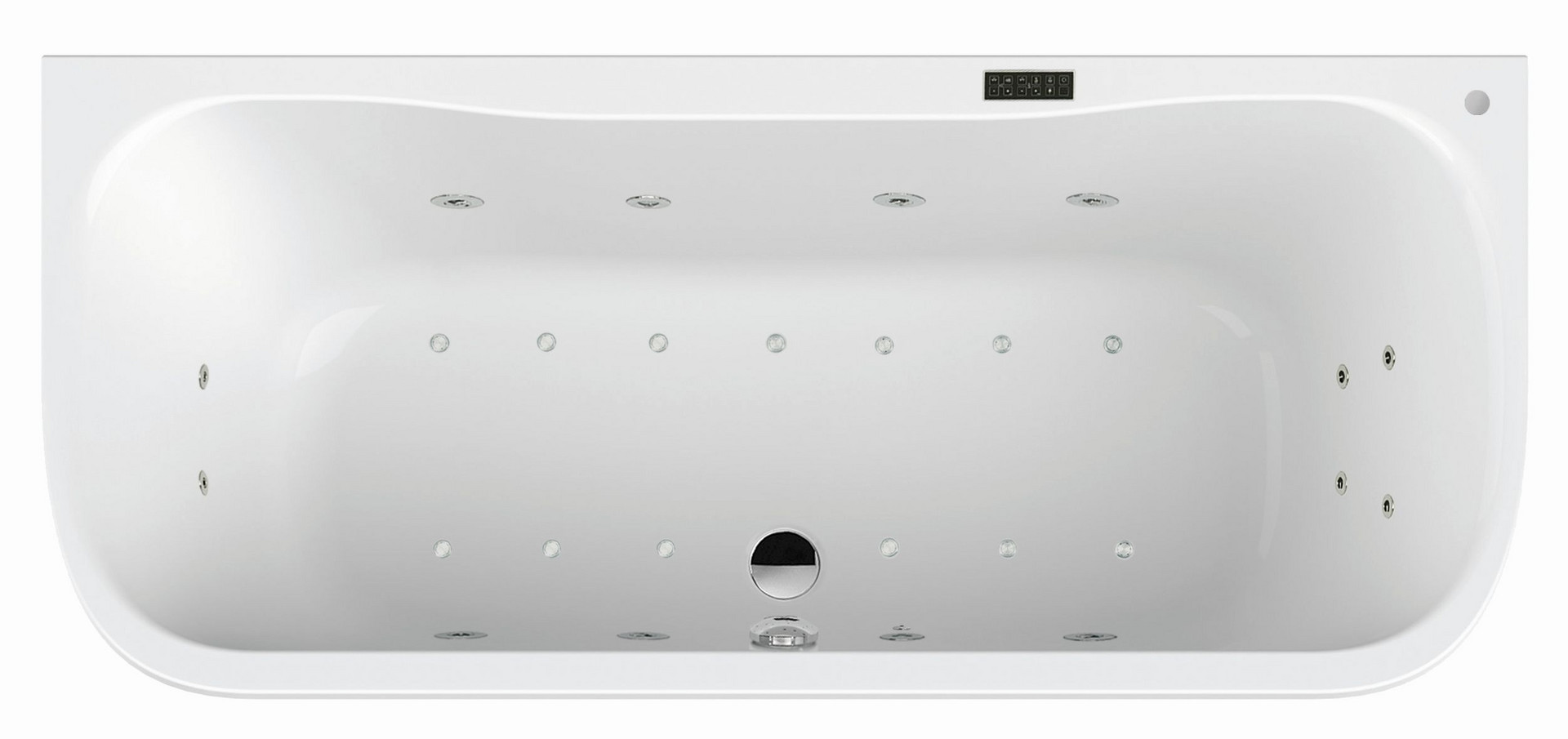aus Acryl, in Sanitärqualität, Ablauf mittig versetzt zur Überlaufbohrung hin, mit bereits verbauten Gestell und Überlauf- sowie Ablaufgarnitur, Ablauf Ø 52 mm, aus Plattenmaterial tiefgezogen,rückseitige Glasfaser-/Polyesterverstärkung und zusätzliche Stabilisierung im Bodenbereich