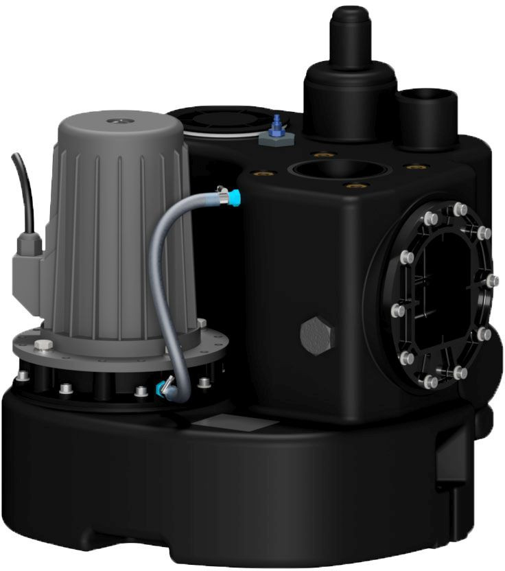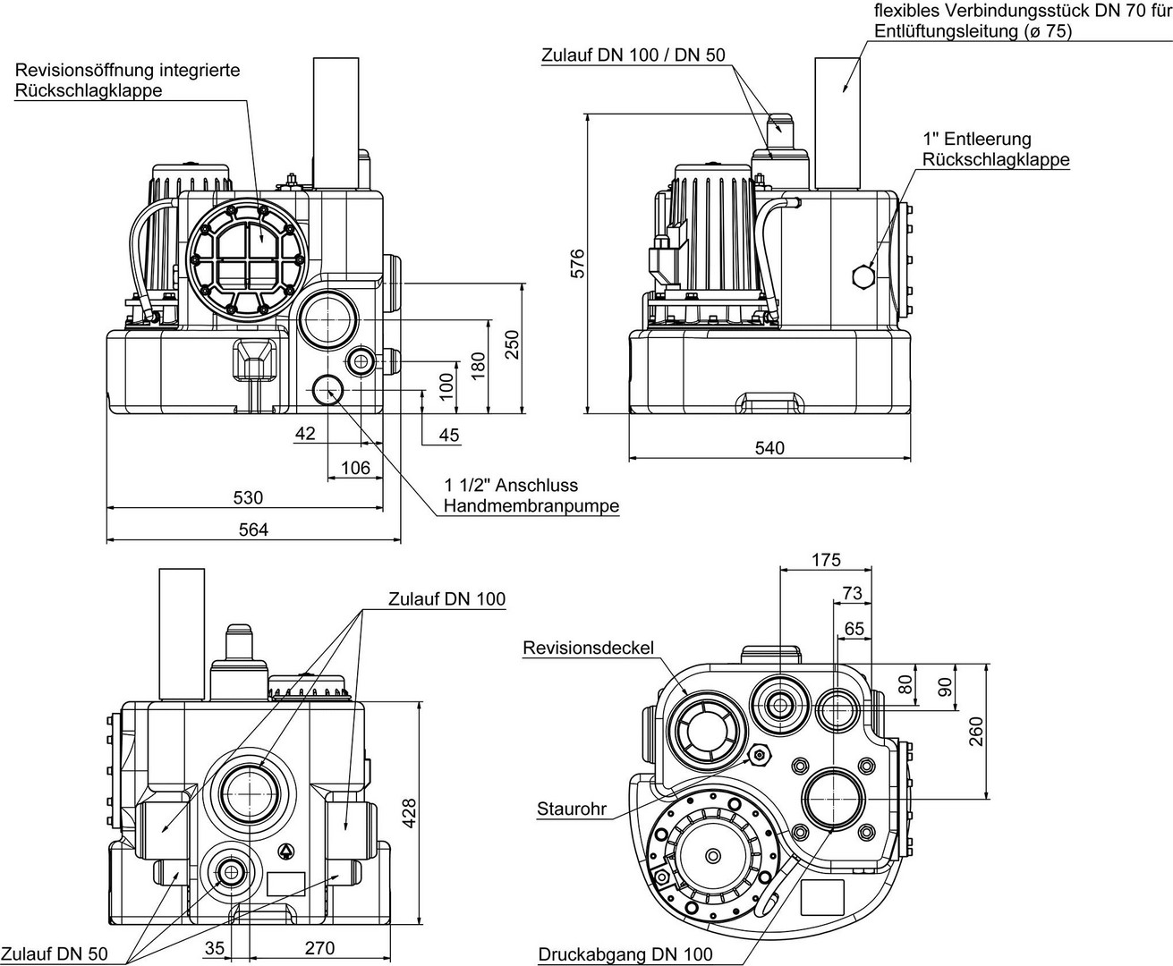 Ausführung: Sammelbehälter aus PE mit 55 l Inhalt mit aufgebauter Freistromlaufradpumpe, Schutzgrad IP 68 - voll überfl utbar, Abdichtung durch Gleitringdichtung und Wellendichtring mit zwischenliegender Ölkammer, Mindestdurchmesser der Einbringöffnung 590 mm, Zulaufhöhe 180 mm: 2x DN 100, 19 l Schaltvolumen, Zulaufhöhe 250 mm: 1x DN 100, 26 l Schaltvolumen, Zulauf vertikal: 1x DN 100/50, 45 l Schaltvolumen, Druckabgang DN 100 mit integrierter Rückschlagklappe, Entlüftung DN 70, Anschluss für Handmembranpumpe 1 1/2“ Steuerung:, pneumatische Niveausteuerung ZPS1 mit Mikrokontroller, LCD-Klartextanzeige für Füllstand, Wartung, Betriebsstunden und Störmeldungen, netzabhängige Alarmanlage, Schaltkasten zur Innenmontage, 3,5 m Verbindungsleitung zwischen Anlage u. Schaltkasten, bestehend aus Flex-Verbindung für Entlüftungsleitung, Flanschstück DN 100 für Druckleitung, Pneumatiksteuerung ZPS1, technische Daten: Spannung: 400 V, Motorleistung P1: 1,4 kW, Motorleistung P2: 1,1 kW, Nennstrom: 2,9 A, Drehzahl: 1400 1/min, max. Förderhöhe: 8,1 m, max. Fördermenge: 41,0 m³/h, max. Medientemperatur: 55 °C