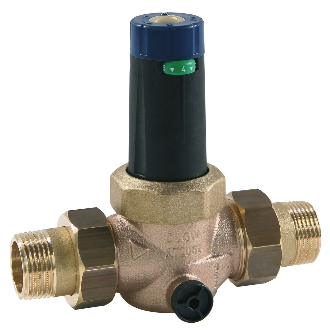 mit beidseitigen Verschraubungen und Schmutzfänger, Manometerstutzen beidseitig 1/4", DVGW-zugelassen, Schallschutzgeprüft in Klasse 1 (DN 15 bis DN 32), Gehäuse aus Rotguss, Kappe aus glasfaserverstärktem Kunststoff, Ausgangsdruck regelbar 1,5-6 bar, voreingestellt auf 4 bar, Eingangsdruck max. 25 bar, Verwendungsbereich Wasser bis max. 30 °C, Pressluft, Gase und nichtklebende, nichtaggressive Medien, Reduzierverhältnis max. 10:1. Einbau senkrecht oder waagerecht