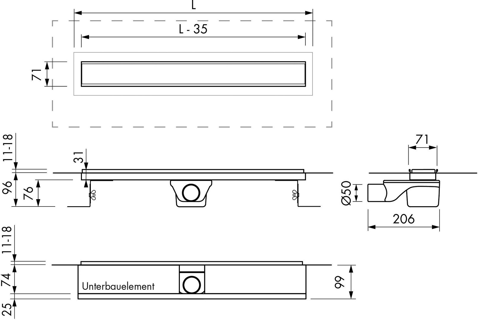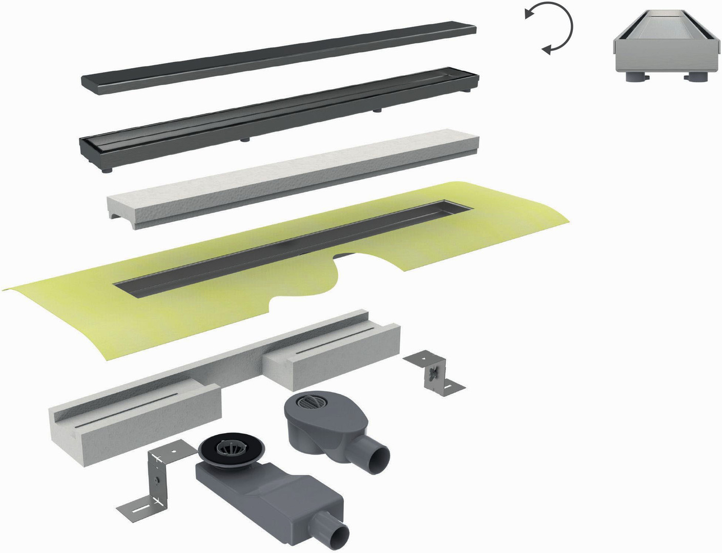 Rinnenkörper mit werkseitig angebrachten Dichtvlies, doppelseitig am Flansch verklebt, 2 aufsteckbare Siphons (28 und 50 mm Sperrwasserhöhe – leicht reinigbar), höhenverstellbarer Fliesenrahmen (7 – 18 mm), Montageblock, Füße, Bauschutzkappe und drehbare Abdeckung (Edelstahl gebürstet bzw. befliesbar), normgerechter Einbau mit 50 mm Sperrwasserhöhe nach DIN 1253 (Ablaufleistung frei 40 l/min – Wand 44 l/min) Sanierungseinbau mit 28 mm Sperrwasserhöhe (Ablaufleistung frei 24 l/min – Wand 26 l/min), Bauhöhe ab 67 mm (Sperrwasserhöhe 28 mm), Bauhöhe ab 96 mm (Sperrwasserhöhe 50 mm)