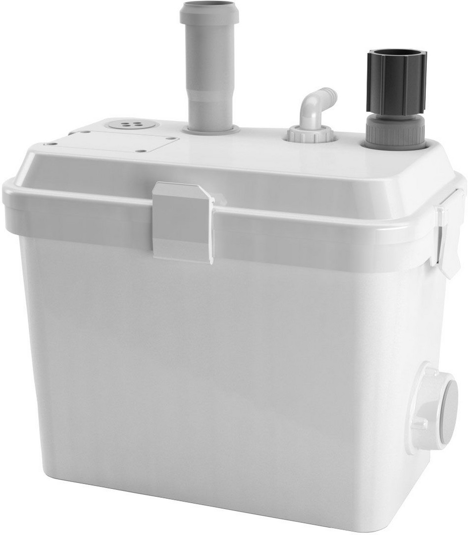 Schmutzwasser-Hebeanlage zum Überflur-Einbau, Sammelbehälter aus PP mit ca. 10 l Nutzinhalt, im Behälterdeckel integriertes Schaltgerät mit akustischer Alarmmeldung bei unzulässig hohem Wasserstand, potentialfreier Kontakt für externen Alarm oder Waschmaschinenstopp, einfache Montage und Wartung durch Schiebestück DN 40 für den Zulaufanschluss Waschtisch, durch direkt am Deckel montierte Pumpe, separater Geräteanschluss mit Schlauchtülle, vorbereiteter, beidseitig nutzbarer Duschzulauf DN 50 (von Behälterunterkante bis Rohrmitte Duschzulauf nur 80 mm), Druckabgang 1 1/4" mit integrierter Rückschlagklappe, Behälterentlüftung durch Aktivkohlefi lter, 1,5 m Anschlusskabel, Spannung: 230 V, Motorleistung P1: 300 W, Motorleistung P2: 130 W, Nennstrom: 1,3 A, Drehzahl: 2800 1/min, max. Förderhöhe: 6,0 m, max. Fördermenge: 8,0 m³/h, max. Medientemperatur: 40 °C (kurzzeitig 90 °C), Korngröße: 10 mm