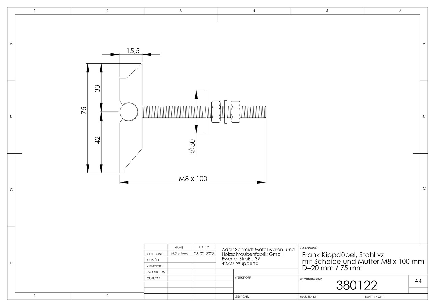 FRANK Kippdübel M 8 x 100 mm, Stahl verzinkt, mit Muttern und U-Scheiben