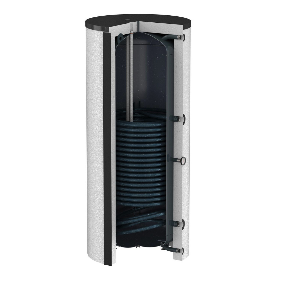 speziell für die Kombination mit Wärmepumpen konstruierter indirekt beheizter Standspeicher mit fest eingeschweißter, besonders groß dimensionierter Doppelrohrschlange, Besichtigungsflansch zum Anschluss zusätzlicher Wärmequellen (Elektroheizung usw.) verwendbar, kombinierbar mit allen modernen Heizungsanlagen, mit Thermometer und Tauchhülse für Temperaturfühler, Fußhöhenverstellung optional, zulässiger Betriebsüberdruck: Rohrschlange/Speicher 16 bar/10 bar, zulässige Betriebstemperatur: Rohrschlange/Speicher 110 °C/95 °C, Emaillierung nach DIN 4753/3 mit Mg-Anode, Besichtigungsflansch DN 205, Isolierung Standardfarbe weiß (RAL 9010), EPS-Isolierung (Brandklasse B1) mit Polypropylendeckschicht (Brandklasse B2)