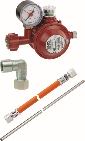 zum Anschluss an Gasflaschen, zur Druckregelung auf den Nenndruck des Gasgerätes, bestehend aus Niederdruckregler Typ EN61-DS mit Überdruck-Sicherheitseinrichtung S2SR (ÜDS), Sichtanzeige, thermischer Absperreinrichtung T (TAE), Manometer, Mitteldruck-Schlauch (Gummi mit Textileinlage, kältebeständig bis -30 °C, Schlauchabmessung 6,3 x 3,5 mm) G 1/4 LH-ÜM x RVS 8 x 400 mm, Verbindungsrohr und Winkel-Aufschraubverschraubung Typ WAI IG G 1/2 x RVS 8