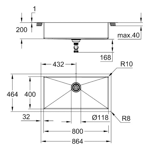 Material Edelstahl AISI 304 (V2A), Materialstärke 1 mm, Long-Life Oberfläche, Oberfläche Satin Finish, Whisper, min. Maß Unterschrank 90 cm, 1 Becken 80 x 40 x 20 cm, Außenradius R11 (Unterbau), R3 (aufliegend), Innenradius R10, FastFixation Schnellbefestigungssystem, Ausschnittmaß (Unterbau) 80,2 x 40,2 cm (R11), Ausschnittmaß (aufliegend/flächenbündig) 84,9 x 44,9 cm (R3), Ablauf Ø 3,5"/9 cm Siebkorbventil, Zubehör beiliegend Ablaufgarnitur, Siebkorbventil, Montageset, alternative Push-Exzenterbedienung in rund (40 986 SD0) separat bestellbar, Anzahl der enthaltenen Befestigungsklammern 8