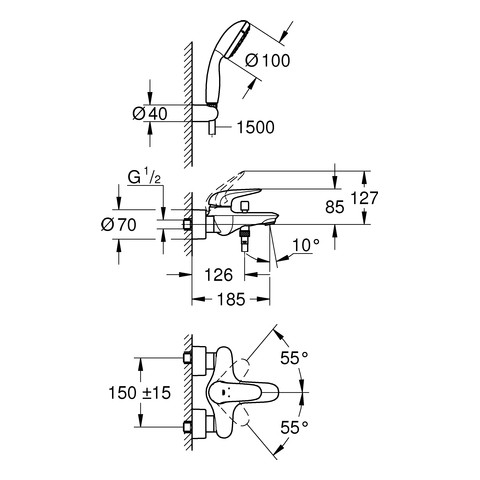GROHE Wannen-Einhebelmischer Eurostyle 1/2", mit Brausegarnitur, geschlossener Metall-Hebelgriff, Wandmontage, chrom