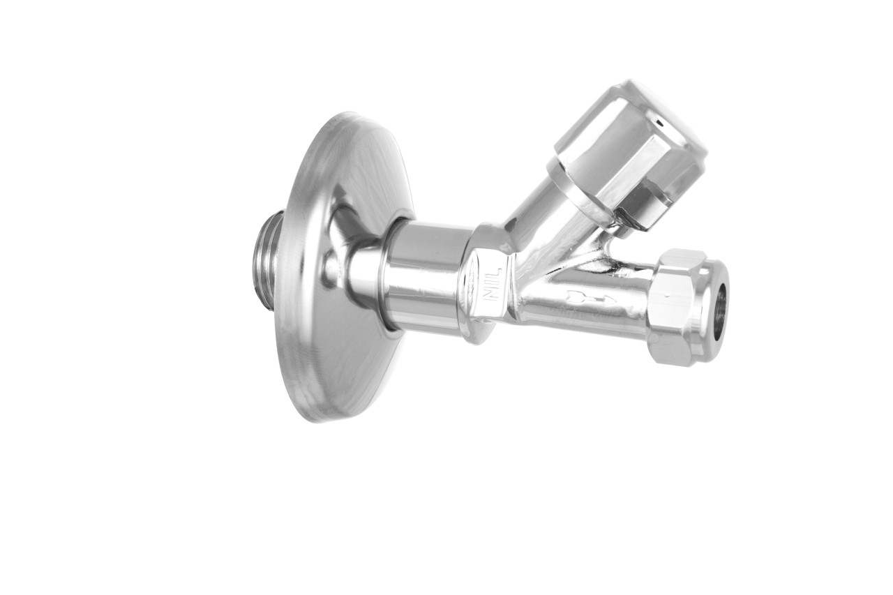 Gampper Schrägsitzventil verchromt, 1/2", lang, mit Quetschverschraubung 3/8"
