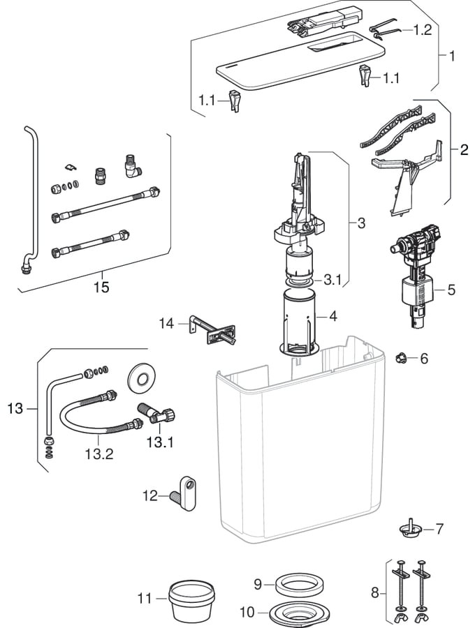 für aufgesetzte Montage, geräuscharm, 2-Mengen-Spülung, gegen Kondenswasserbildung gedämmt, max. Wassertemperatur 25 °C, Spülmenge Werkseinstellung 9 und 4 l, große Spülmenge Einstellbereich 6/9 l, kleine Spülmenge Einstellbereich 4 l, bestehend aus Eckventil 1/2", Dichtung aus EPDM, Kupferrohr gebogen, Rosette verchromt, Befestigungsmaterial