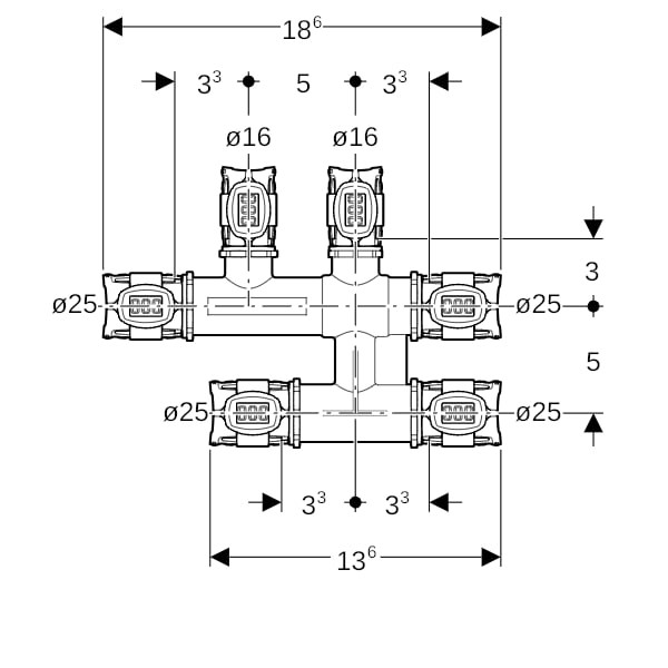 Geberit Kreuzungs-T-Stück FlowFit Ø 25 x 16 x 25 mm, 186 mm, mit Dämmbox