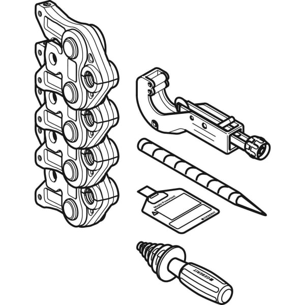 bestehend aus 2x Pressbacken, Rohrschneider, Fettstift mit versenkbarer Mine, gelb, PowerTest, Entgrat- und Kalibrierwerkzeug, servicefrei, Einhändig bedienbar, für Funktionsprüfung mit PowerTest geeignet, zum Verpressen von Mepla Pressfittings