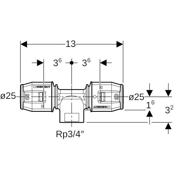 Geberit T-Stück PushFit Ø 25 x 25 mm x Rp 3/4, mit IG, Messing