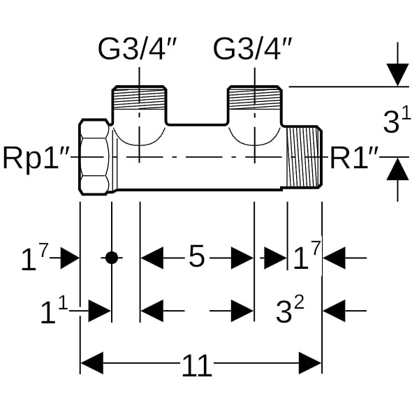Geberit Verteiler 1" x 3/4" x 1", 2-fach, mit Gewindeanschluss, Messing