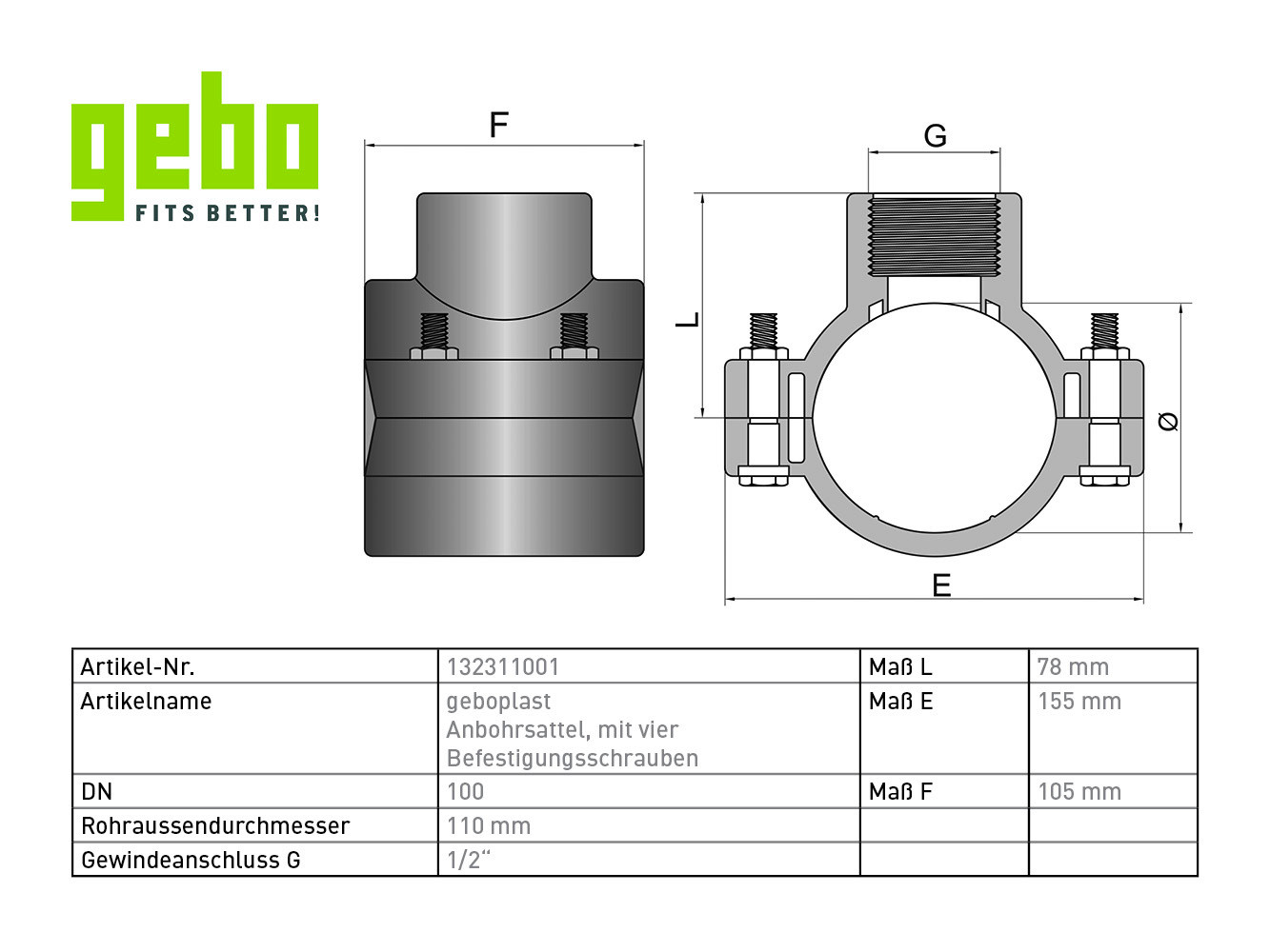 Gebo Plast Anbohrschelle 110 mm x 1/2", mit 4 Befestigungsschrauben