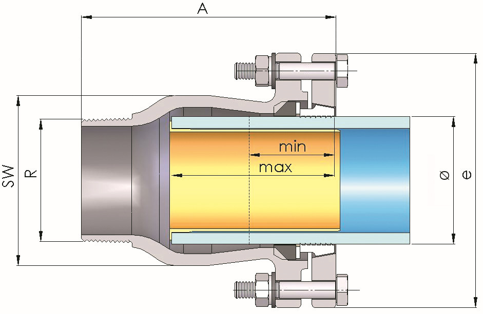 die Temperguss-Klemmverbinder mit AG für PE 80, PE 100, PE-Xa-Rohr (jeweils SDR 11) nach DVGW – Arbeitsblatt GW 335 A2/A3 sowie DIN 8074/75, DIN EN 12201-2 und DIN 16893, Medien sind Wasser und Druckluft, die Druckstufe für Wasser bei 20 °C ist PN 10