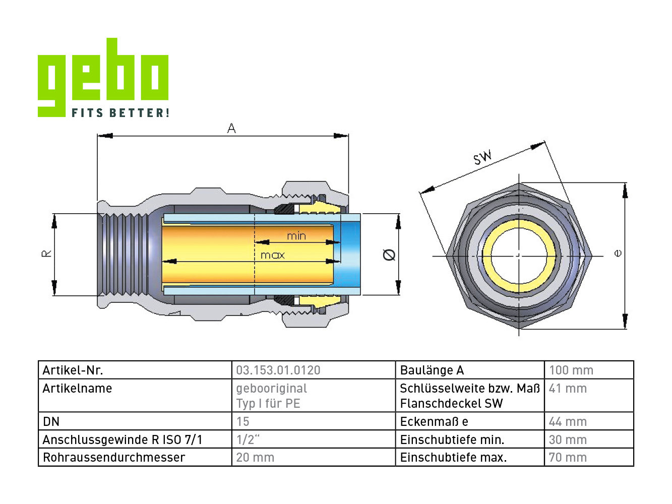 Gebo Verschraubung I Serie 153 1/2" x 20 mm, für PE 80/100/Xa-Rohr
