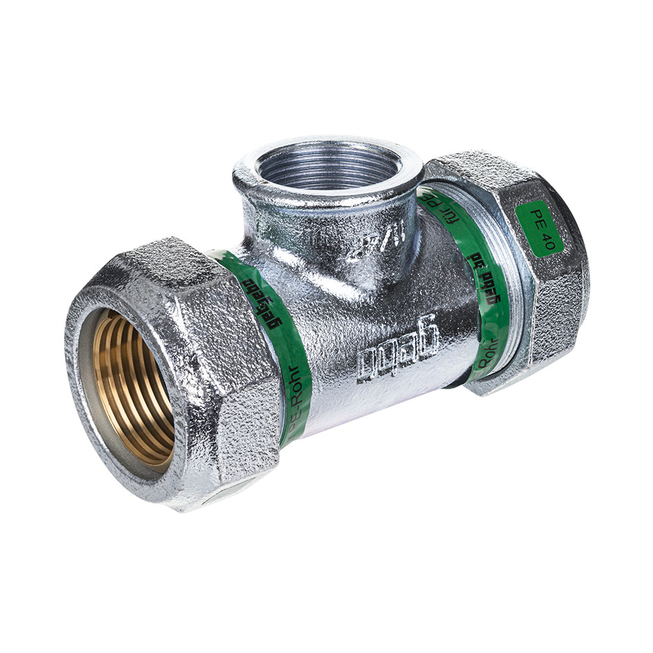 Temperguss-Klemmverbinder, beidseitig zum Klemmen, Abgang mit IG, für PE-Rohr: PE80, PE100, PE-Xa-Rohr nach DVGW-Arbeitsblatt GW 355 A2/A3 DIN 8074/75 und DIN EN 12201-2 und DIN 16893, 20-63 mm, Medien sind Wasser, Gas und Druckluft, Druckstufen bei Wasser PE80 und PE-Xa PN 12,5, PE100, PN 16, bei Gas PE80, PE100 und Pe-Xa PN 4 und bei Druckluft PE80, PE-Xa PN 10, PE100 PN 12,5, Prüfungen Wasser DIN 8076/DIN EN 10284, DVGW-Reg.-Nr. CW-7511CP0631, Gas DVGW Arbeitsblatt G 5600-1, DVGW-Reg.-Nr. DG-7521CP0412, der Einsatz von Stützhülsen ist notwendig