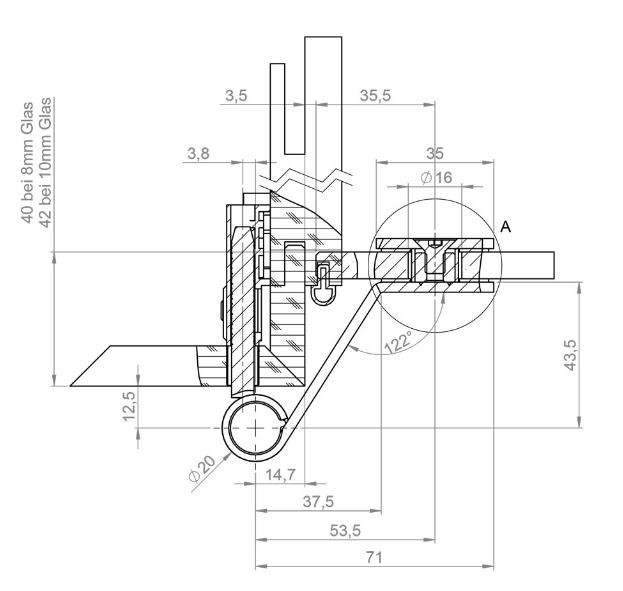 Dreiteiliges Glastürband für Ganzglastüren an stumpfen Zargen mit Zargenkonstruktionen V3600 DIN links Hohe Tragkraft durch wartungsfreie Gleitlagerung Höhe: 100mm Material: 3mm Rollendurchmesser: 20mm Glassstärke: 8/10mm Belastungswert: 80kg