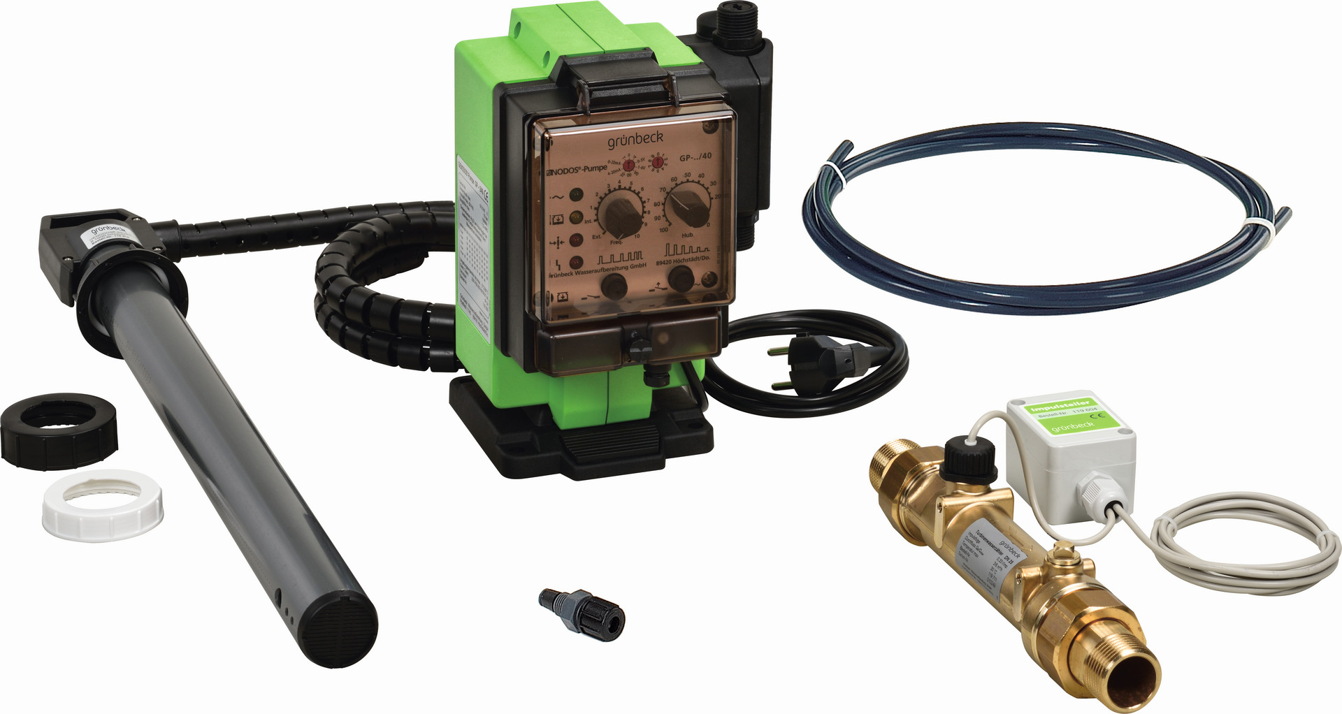 zur Dosierung von GENO-oxi plus, bestehend aus Dosierpumpe GP-/40, Kontaktwasserzähler, Sauglanze für Transportdosierbehälter 20 kg, Dosierventil 4/6 und Dosierleitung 4 m