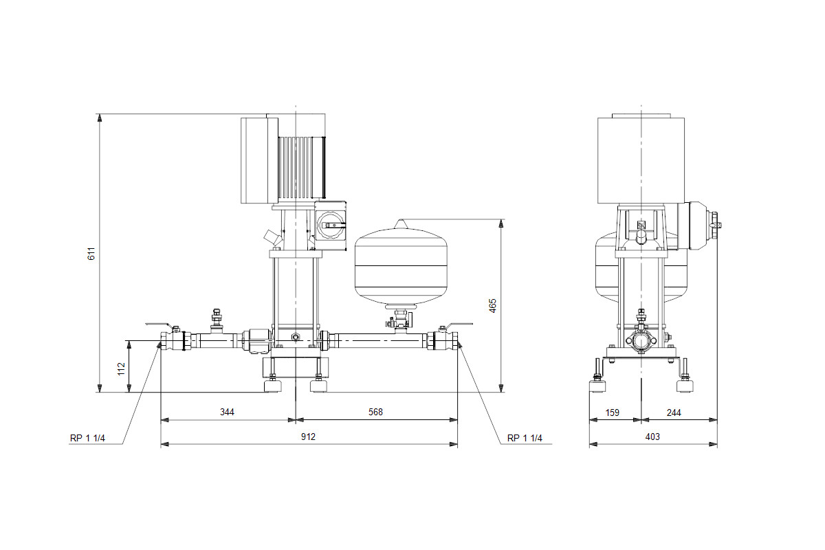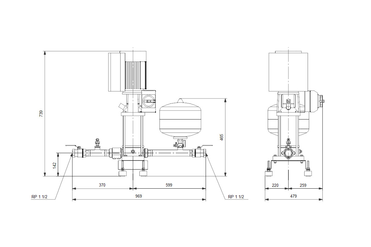 bestehend aus einer vertikalen Inline-Kreiselpumpe (CRIE) mit IE5-Motor und integriertem Frequenzumrichter mit Grafikdisplay, ausgestattet mit Absperrventil, Rückschlagventil, Zulauf- und druckleitung, Drucksensor, Membrandruckbehälter, Eingangsdrucksensor und Grundrahmen mit Schwingungsdämpfern und Hauptschalter, integrierter Überlast- und Temperaturschutz, Medientemperatur 5° C bis +60° C, Umgebungstemperatur 0° C bis +40° C, maximal zulässiger Betriebsdruck 16 bar, Stromversorgung 1x230 V, 50-60 Hz, Behälter mit 18L PN10 (außer H Solo-E CRIE 5-9 mit 12L PN16), Wärmeklasse F, Sammelrohr Edelstahl, Fußstück Edelstahl 1.4401, Motor Standardmäßig Wirkungsgradklasse IE5