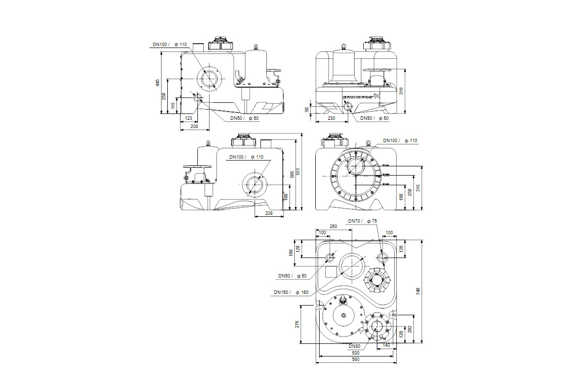 steckerfertige überflutbare Fäkalienhebeanlage mit druckdichtem Sammelbehälter, einer vormontierten Pumpe mit eingebautem Motorschutz, Zulaufdrehflansch mit Anschlussmuffe und Muffensteckdichtung DN 100, Anschlussstutzen DN 70 für Lüftungsleitung und elastischem Verbinder mit Schellen, zusätzliche Zulaufmuffen in DN 150 und DN 100 sowie 3 Zulaufmuffen in DN 50, einschließlich einer Muffensteckdichtung für den Anschluss einer Handmembranpumpe, einer Rückschlagklappe DN 80, Übergangsstück für Druckabgang mit Flansch DN 80 auf Stutzen 110 mm, elastischer Verbinder für Druckleitungsanschluss DN 100 mit Schellen, piezoresistivem Drucksensor in der Steuerung zur millimetergenauen Ermittlung aller erforderlichen Pegel, wie Normal-, Hochwasser-/Alarmniveau, Mikroprozessorsteuerung mit eingebauter Alarmanlage, 4 m Leitung zwischen Pumpe und Steuerung, 0,8 m Netzanschlussleitung sowie Schutzkontakt- oder CEE-Stecker, Befestigungsmaterial zur Auftriebssicherung