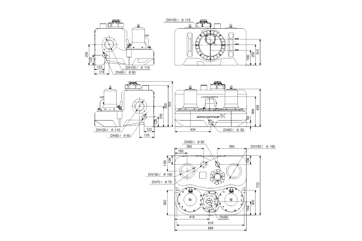 steckerfertige überflutbare Fäkalienhebeanlage mit druckdichtem Sammelbehälter, zwei vormontierten Pumpen mit eingebautem Motorschutz, Zulaufdrehflansch mit Anschlussmuffe und Muffensteckdichtung DN 100, Anschlussstutzen DN 70 für Lüftungsleitung und elastischem Verbinder mit Schellen, zwei zusätzlichen Zulaufmuffen in DN 150 und DN 100 sowie 4 Zulaufmuffen in DN 50, einschließlich einer Muffensteckdichtung für den Anschluss einer Handmembranpumpe, einer kompakten Doppelrückschlagklappeneinheit DN 80, Übergangsstück für Druckabgang mit Flansch DN 80 auf Stutzen 110 mm, elastischer Verbinder für Druckleitungsanschluss DN 100 mit Schellen, piezoresistivem Drucksensor in der Steuerung zur millimetergenauen Ermittlung aller erforderlichen Pegel, wie Normal-, Hochwasser-/Alarmniveau, Mikroprozessorsteuerung mit eingebauter Alarmanlage, 4 m Leitung zwischen Pumpe und Steuerung, 0,8 m Netzanschlussleitung sowie Schutzkontakt- oder CEE-Stecker, Befestigungsmaterial zur Auftriebssicherung