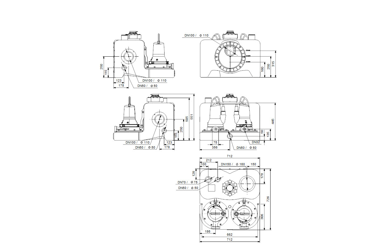 steckerfertige überflutbare Schneidrad-Fäkalienhebeanlage mit druckdichtem Sammelbehälter, zwei vormontierten Pumpen mit eingebautem Motorschutz, Zulaufdrehflansch mit Anschlussmuffe und Muffensteckdichtung DN 100, Anschlussstutzen DN 70 für Lüftungsleitung und elastischem Verbinder mit Schellen, zusätzlichen Zulaufmuffen in DN 150 und DN 100 sowie 3 Zulaufmuffen in DN 50, einschließlich einer Muffensteckdichtung für den Anschluss einer Handmembranpumpe, Druckabgang als Flanschbrille DN 32 mit IG Rp 1 1/4, piezoresistivem Drucksensor in der Steuerung zur millimetergenauen Ermittlung aller erforderlichen Pegel, wie Normal-, Hochwasser-/Alarmniveau, Mikroprozessorsteuerung mit eingebauter Alarmanlage, 10 m Leitung zwischen Pumpe und Steuerung, 0,8 m Netzanschlussleitung sowie Schutzkontakt- oder CEE-Stecker, Befestigungsmaterial zur Auftriebssicherung