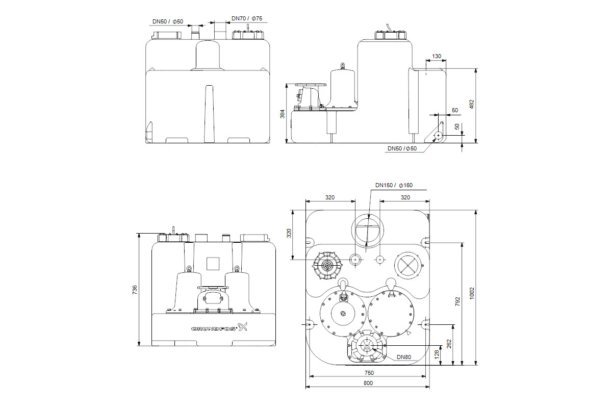 steckerfertige überflutbare Fäkalienhebeanlage mit druckdichtem Sammelbehälter und Zulaufmuffe DN 150, elastischer Steckdichtung DN 150 als Zulaufmuffe, Anschlussstutzen DN 70 für Lüftungsleitung mit elastischem Verbinder und Schellen, zwei zusätzliche Zulaufstutzen Ø 50 mm, zwei vormontierten Pumpen mit eingebautem Motorschutz, kompakter Doppelrückschlagklappeneinheit DN 80, Übergangsstück für Druckabgang Flansch auf Stutzen DN 80/Ø 110 mm, elastischer Verbinder für Druckleitungsanschluss DN 100 mit Schellen, piezoresistivem Drucksensor in der Steuerung zur millimetergenauen Ermittlung aller erforderlichen Pegel, wie Normal-, Hochwasser-/Alarmniveau, elektrischer Signalverarbeitung, komfortable Mikroprozessorsteuerung mit eingebauter Alarmanlage, 4 m Leitung zwischen Pumpe und Steuerung, 0,8 m Netzanschlussleitung mit Schutzkontakt oder CEE-Stecker mit Phasenwender und Befestigungsmaterial zur Auftriebssicherung