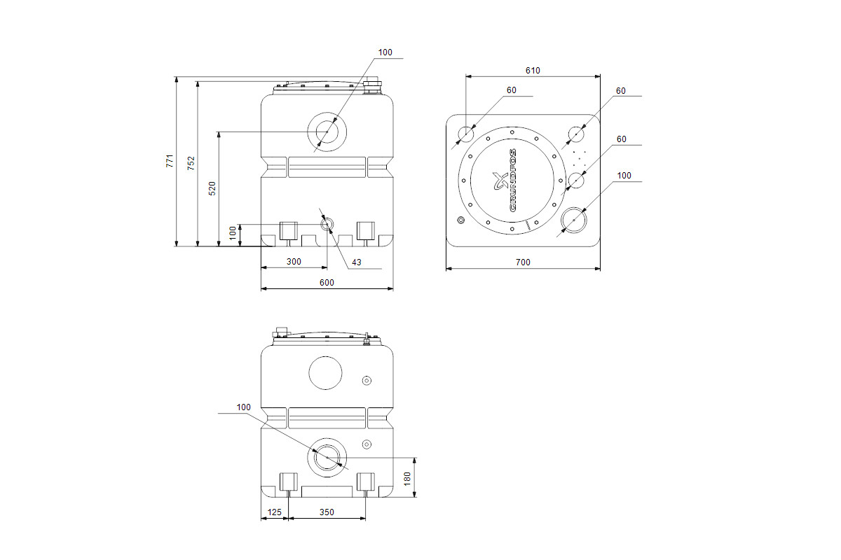 Schmutzwassersammelbehälter aus PE in Überflurausführung zur Aufnahme einer Tauchmotorpumpe (UNOLIFT) bzw. von zwei Tauchmotorpumpen (DUOLIFT), für den Einsatz von Kellerentwässerungspumpe(n) UNILIFT CC bzw. Tauchmotorpumpen UNILIFT AP35/50B, mit Zulaufdichtungen und Rohrleitungskomponenten zur Anbindung der Pumpe an den Behälter einschließlich Befestigungsmaterial zur Bodenbefestigung