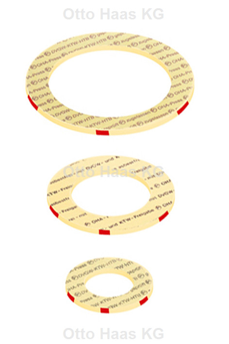 OHA-Press entsprechend DVGW-Vorschrift DIN 30653 als Flachdichtungswerkstoff, nach DIN EN 1514-1, DVGW-SVGW zugelassen nach DIN 3535-6, temperaturbeständig 650 °C/5 bar, Einsatz in Sauerstoff BAM DIN 1797:2002-02, antihaft-beschichtete Dichtfläche, mit 3x roter Farbmarkierung