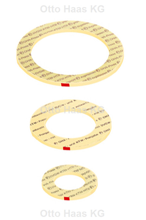 OHA-Press entsprechend DVGW-Vorschrift DIN 30653 als Flachdichtungswerkstoff, nach DIN 33822 und DIN 325, DVGW-SVGW zugelassen nach DIN 3535-6, temperaturbeständig 650 °C/5 bar, Einsatz in Sauerstoff BAM DIN 1797:2002-02, antihaft-beschichtete Dichtfläche, mit 1x roter Farbmarkierung