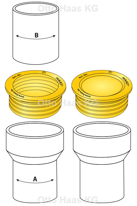 innenliegender Adapter, zur Verbindung und Reduzierung von Abwasserrohren mit unterschiedlichen Außen- bzw. Innenrohrdurchmessern, druckdicht bis 0,5 bar, passend für Faserzementrohr/Eternitrohr/Geberit PE/Geberit Silent-db 20/Geberit Silent-PP/Gusseisenrohr GGG duktil/HT-Rohr, KG-Rohr/LNA Gusseisenrohr/LORO-X/POLO-KAL NG/Skolan db, SML/MLB/Steinzeugrohr Harsch und Wavin AS, EPDM alterungs- und witterungsbeständig