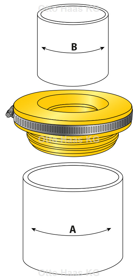 innenliegender Adapter, zur Verbindung und Reduzierung von Abwasserrohren mit unterschiedlichen Außen- bzw. Innenrohrdurchmessern, zur Reduzierung von unterschiedlichen Rohrdimensionen für waagerechten wie senkrechten Einbau geeignet, passend für Faserzement-/Eternitrohr/Geberit PE/Geberit Silent-db 20/Geberit Silent-PP/Gusseisenrohr GGG duktil/HT-Rohr/KG-Rohr/LNA Gusseisenrohr/LORO-X/POLO-KAL NG/Skolan db/SML/MLB/Steinzeugrohr Harsch und Wavin AS, druckdicht bis 0,5 bar, UV-beständig, CE-konform, EPDM alterungs- und witterungsbeständig nach DIN EN 681-1, mit Schlauchklemmen W2, Band und Gehäuse aus nichtrostendem Chromstahl 1.l4016 X6Cr17 nach DIN 3017-1, SW 7, Außensechskantschraube W1