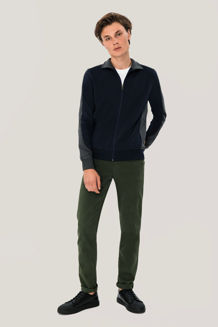 Besonders strapazierfähige Sweatjacke mit kontrastfarbigen Einsätzen an den Seiten, Schultern und Ärmeln, formstabilen Bündchen mit LYCRA®-Anteil, nicht angerauter Innenseite (French-Terry), Nackenband, hochwertigem Frontreißverschluss und seitlichen Einschubtaschen mit Reißverschluss. Alle Reißverschlüsse von YKK®. Leasingkoller zur einfachen Kennzeichnung in der gewerblichen Wäscherei und Aufhängebänder im Saum. Hergestellt aus weicher, besonders pflegeleichter und funktioneller Maschenware aus dem HAKRO Performance-Materialmix Mikralinar®. Gewebtes HAKRO Necklabel aus hochwertigem Kettsatin mit weichen, ultraschallgeschnittenen Bandkanten für höchsten Tragekomfort und gewebtes HAKRO Flaglabel an der linken Seitennaht.