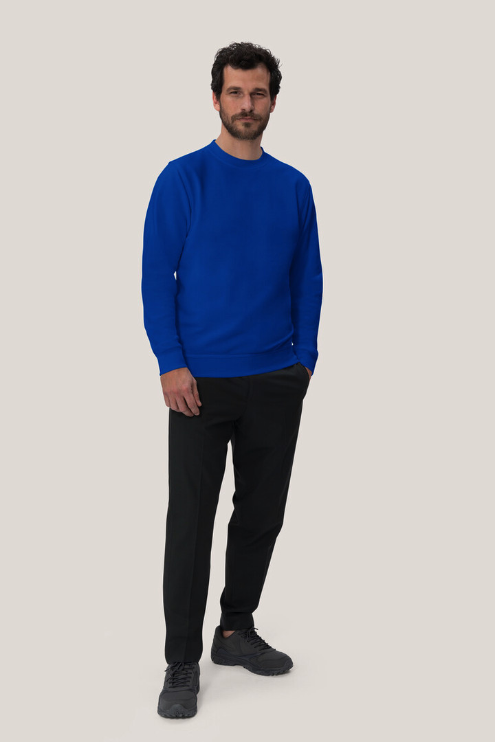 Besonders strapazierfähiges Sweatshirt mit rundem Halsausschnitt, formstabilen Bündchen mit LYCRA®-Anteil, nicht angerauter Innenseite (French-Terry) und Nackenband. Leasingkoller zur einfachen Kennzeichnung in der gewerblichen Wäscherei und Aufhängebänder im Saum. Hergestellt aus weicher, besonders pflegeleichter und funktioneller Maschenware aus dem HAKRO Performance-Materialmix Mikralinar®. Gewebtes HAKRO Necklabel aus hochwertigem Kettsatin mit weichen, ultraschallgeschnittenen Bandkanten für höchsten Tragekomfort und gewebtes HAKRO Flaglabel an der linken Seitennaht.