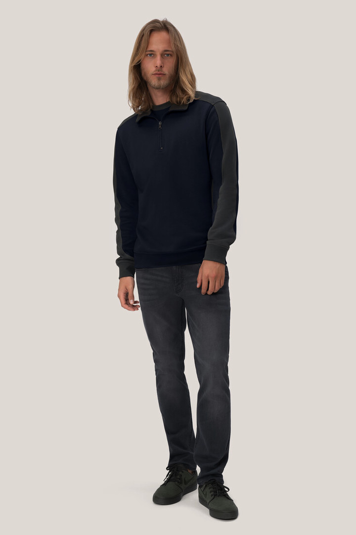 Besonders strapazierfähiger Troyer mit kontrastfarbigen Einsätzen an den Seiten, Schultern und Ärmeln, hochwertigem Reißverschluss von YKK®, formstabilen Bündchen mit LYCRA®-Anteil, nicht angerauter Innenseite (French-Terry) und Nackenband. Leasingkoller zur einfachen Kennzeichnung in der gewerblichen Wäscherei und Aufhängebänder im Saum. Hergestellt aus weicher, besonders pflegeleichter und funktioneller Maschenware aus dem HAKRO Performance-Materialmix Mikralinar®. Gewebtes HAKRO Necklabel aus hochwertigem Kettsatin mit weichen, ultraschallgeschnittenen Bandkanten für höchsten Tragekomfort und gewebtes HAKRO Flaglabel an der linken Seitennaht.