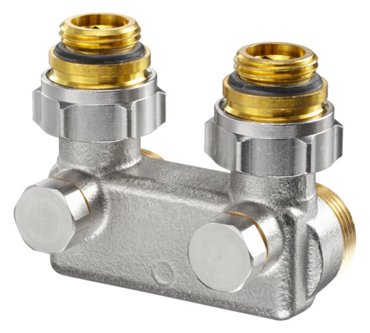 Flamco Zweirohr-Hahnblock EXCLUSIV D1/50 G 3/4 M Eurokonus x G 1/2 M, Durchgang, mit Nippel, Messing vernickelt